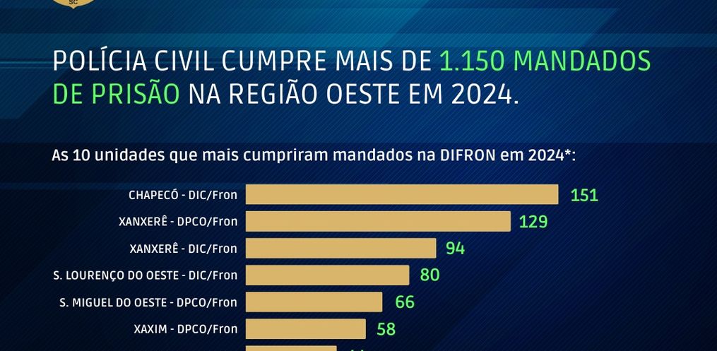 Segundo a Polícia Civil, entre 1º de janeiro e 15 de dezembro, foram cumpridos 1.165 mandados de prisão, um crescimento de 13,77% em comparação ao mesmo período do ano anterior. Destaque para as unidades de Chapecó, Xanxerê e São Lourenço do Oeste, que lideraram o ranking de prisões. São Miguel do Oeste também aparece com forte atuação, totalizando 66 mandados cumpridos pela DPCO/FRON e 40 pela DIC/FRON da cidade.