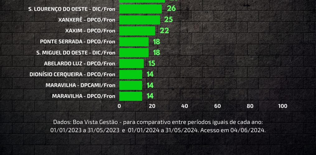 A Polícia Civil de Santa Catarina, através da Diretoria de Polícia da Fronteira (DIFRON/PCSC), apresentou nesta quarta-feira, 05, os indicadores de criminalidade referentes ao ano de 2024 para os 89 municípios da região oeste do estado.