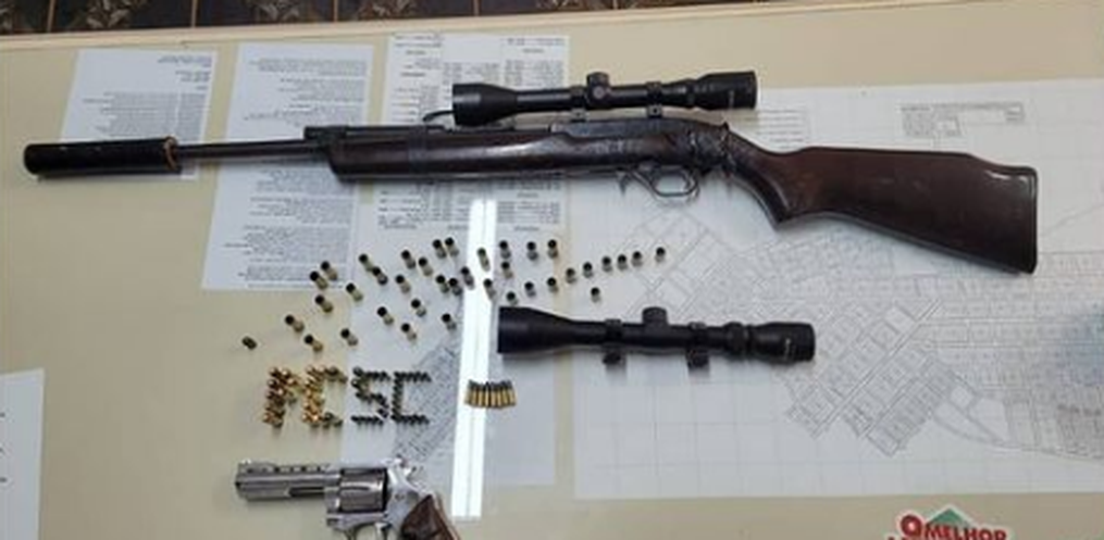 Foram apreendidas, além de munições, duas armas de fogo: uma espingarda calibre 22 e um revólver calibre .38.