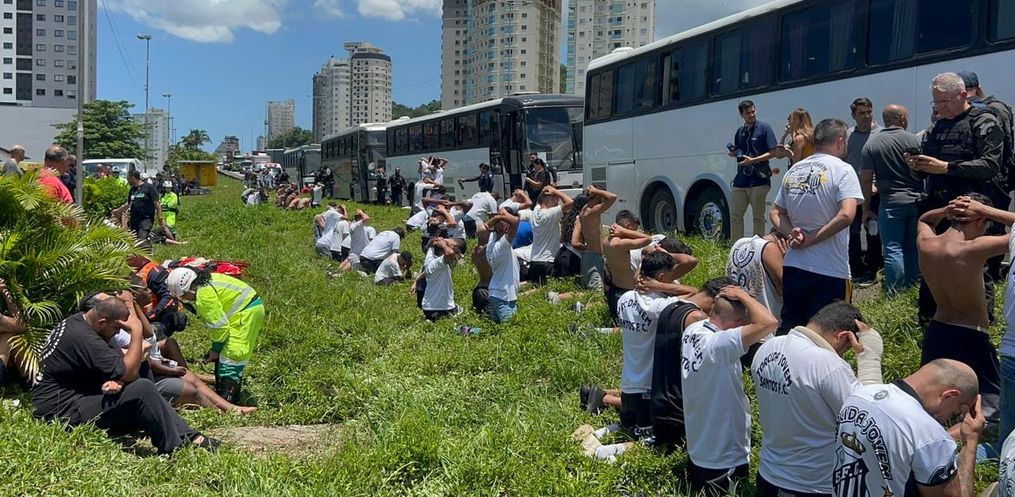 A Polícia Rodoviária Federal acredita que 200 torcedores do Santos e do Internacional estão envolvidos na briga que parou a BR-101 em Itapema na manhã desta quinta-feira, 4. Conforme as autoridades, o grupo paulista, que estava em sete ônibus, armou uma emboscada para os gaúchos, que estavam em apenas um ônibus.