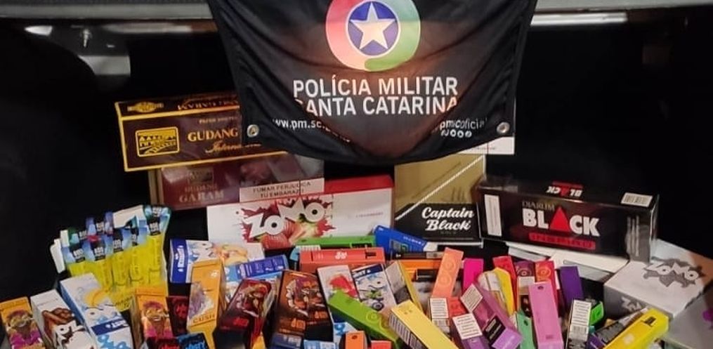 No carro, os policiais encontraram grande quantidade de produtos oriundos de contrabando incluindo cigarros eletrônicos, essências e vários maços de cigarros.