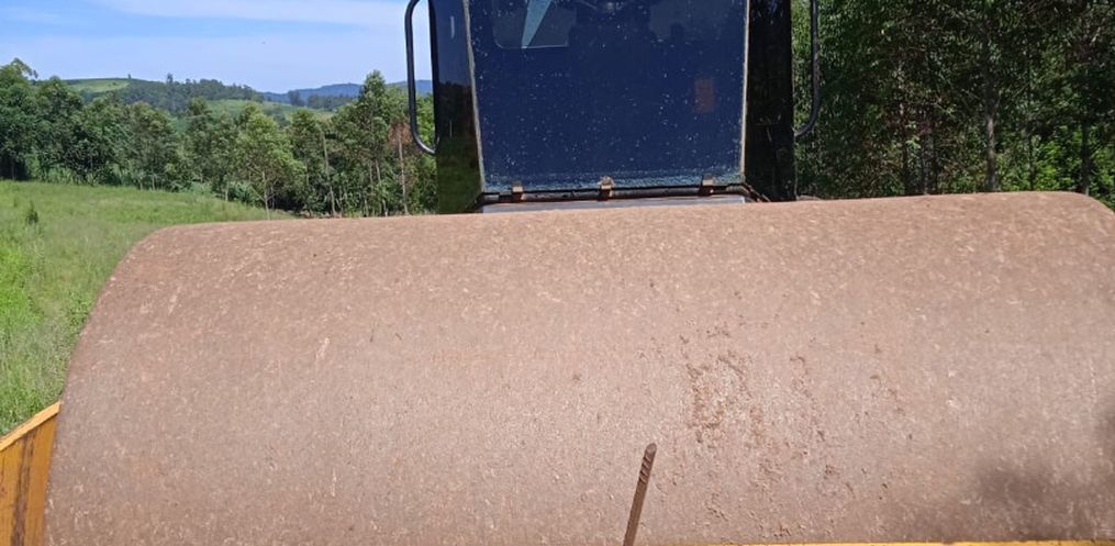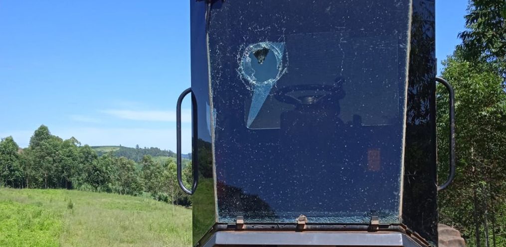 Um rolo compactador que estava estacionado em uma propriedade agrícola teve o para-brisa quebrado por uma pedrada. A máquina estava sendo utilizada na manutenção de estradas com a compactação do cascalho.