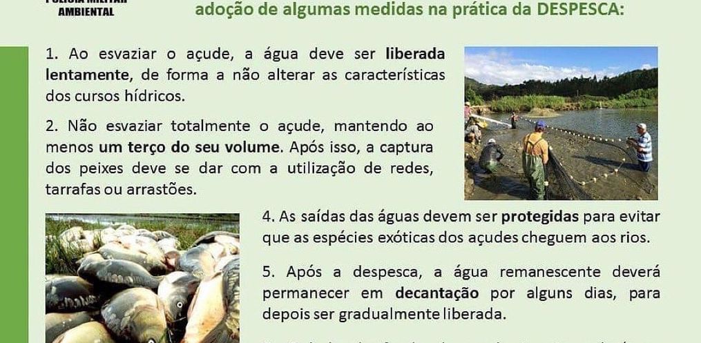 A prática correta de despesca, orientada pela Polícia Militar Ambiental, é que a água do reservatório seja liberada apenas até a metade, e depois fazer a despesca com redes e tarrafas ou outros métodos. Somente dias depois deve ser liberado o restante da água, exceto o lodo que permanece no fundo. Este lodo, se descartado no rio, se caracteriza como infração ambiental.