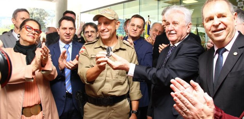 O presidente da Alesc, deputado estadual Moacir Sopelsa, e os demais deputados fizeram a entrega simbólica das chaves ao comandante-geral da PMSC, coronel Marcelo Pontes.