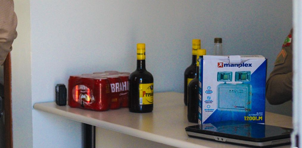 Foi possível constatar o furto de 22 latas de cervejas, 7 refrigerantes, 4 litros de bebida alcoólica, 20 pacotes de salgadinho e mais 10 caixas de refrigerante de lata, além de chocolates e uma luminária de emergência.