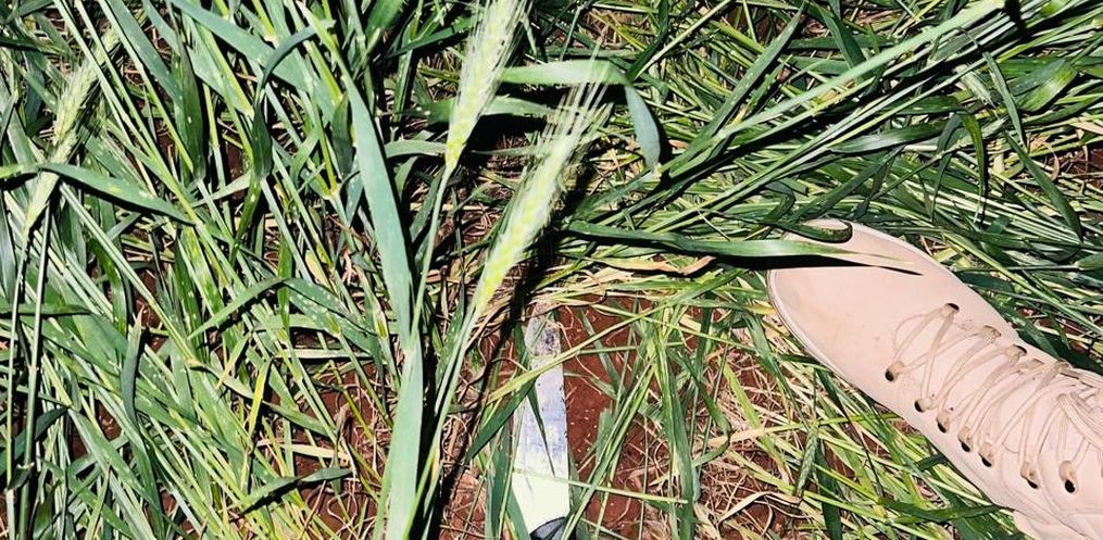 No local, os policiais perceberam que a via estava bloqueada e iniciaram buscas após notarem pegadas na lavoura. Em determinado momento, o suspeito, que estava deitado no meio do trigo, atacou um dos policiais com a faca, acertando a cabeça, próximo da têmpora esquerda.