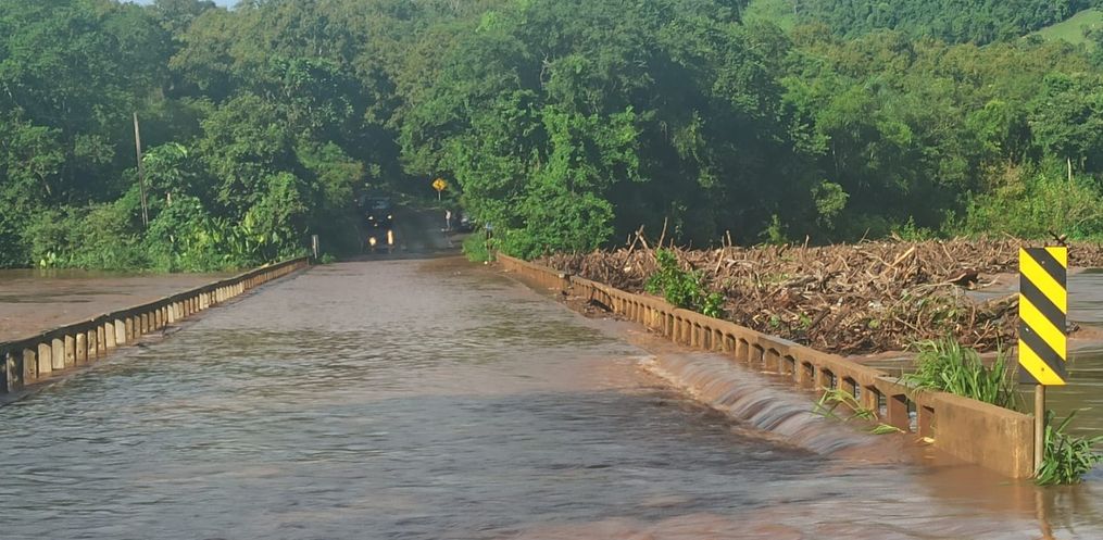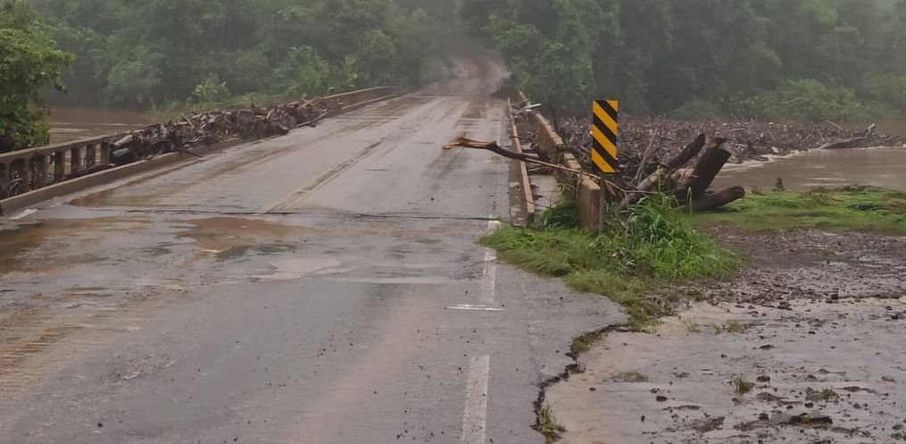 A ponte sobre o Rio Sargento, na SC-161, que liga os municípios de Romelândia e Flor do Sertão, continua fechada para trânsito nesta manhã de sexta-feira, 25. O fluxo de veículos foi interrompido depois que a água do rio acabou deixando a ponte submersa com grande volume de chuva registrada nesta quinta-feira, 24.
