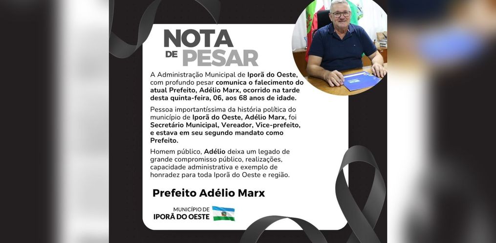 A Administração Municipal de Iporã do Oeste, com profundo pesar, comunica o falecimento do Prefeito Adélio Marx, ocorrido na tarde desta quinta-feira, 6 de junho, aos 68 anos.