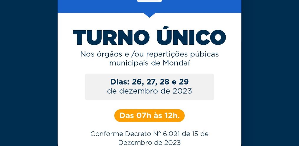 O Município de Mondaí vai adotar turno único de trabalho em todas as repartições públicas municipais na última semana do ano. O horário diferenciado de atendimento terá início no dia 26 de dezembro e será das 07h às 12h, com retorno à normalidade no dia 02 de janeiro de 2024. De acordo com o secretário de Saúde de Mondaí, Guinter Otto Dreher, a medida vai alterar também os atendimentos na área da saúde, que serão prestados somente pela manhã.