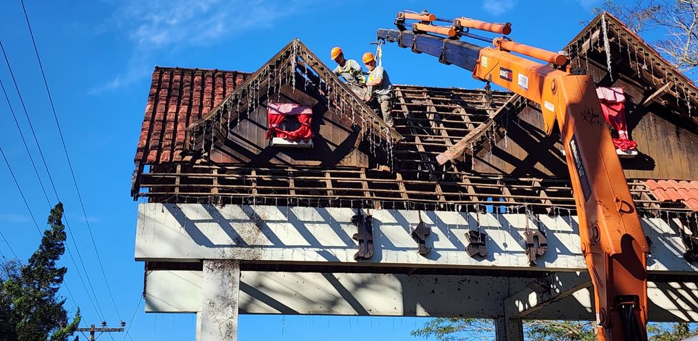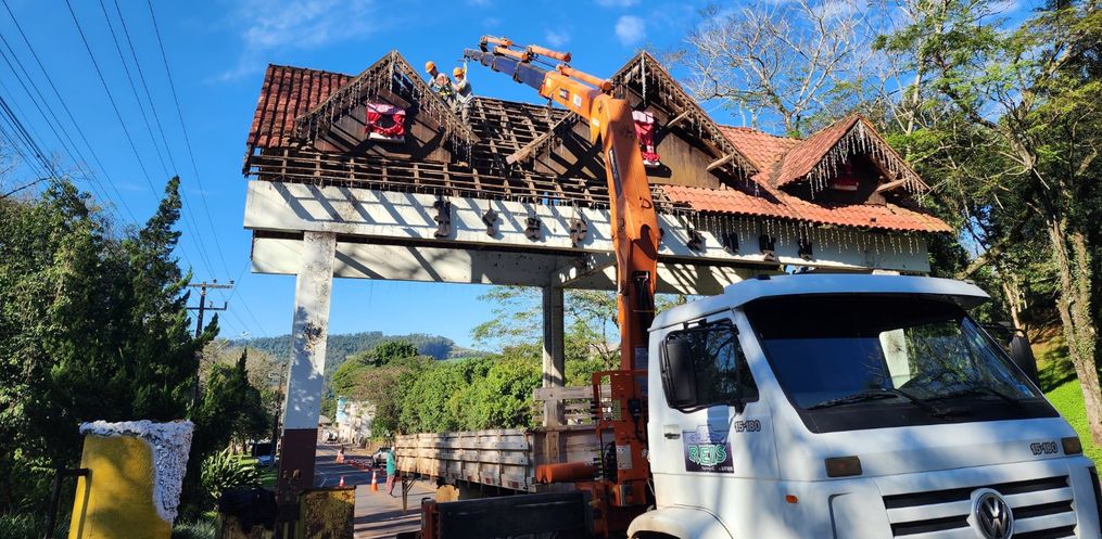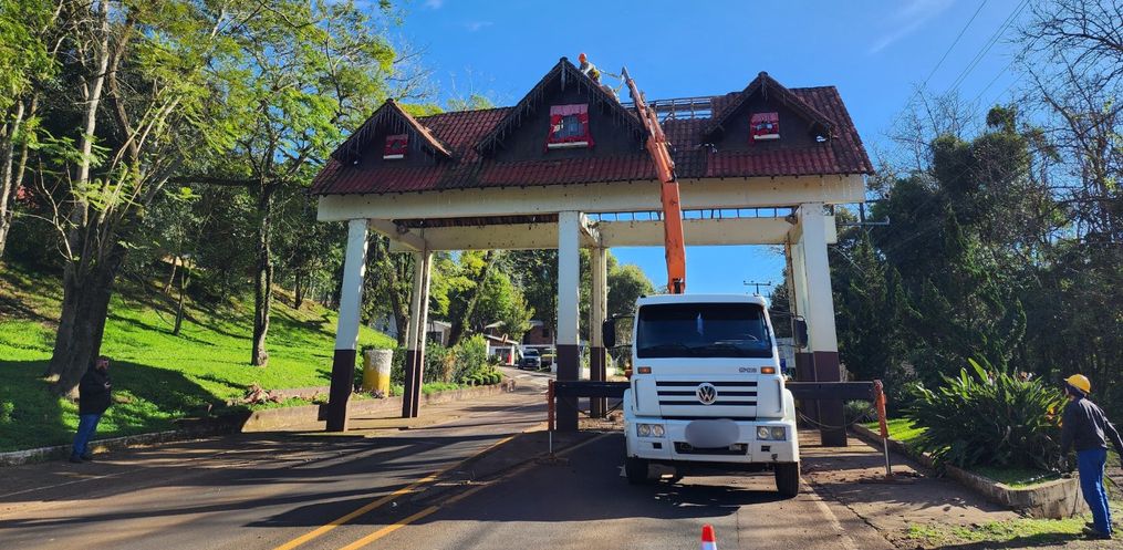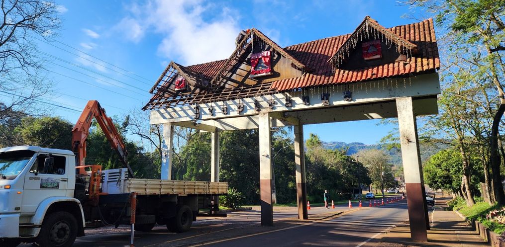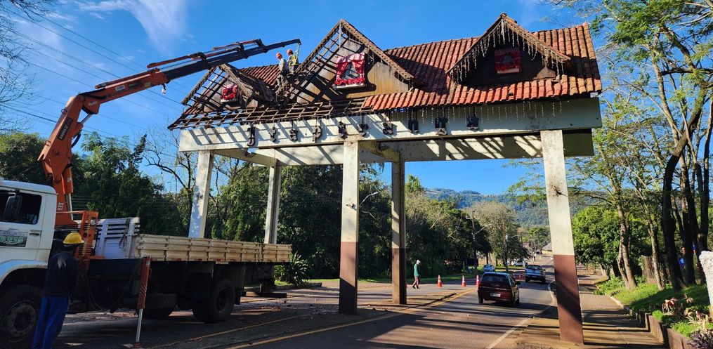 O trabalho de remoção do telhado do pórtico foi iniciado na manhã desta quarta-feira, 02, com objetivo de dar segurança a quem trafega pela rodovia e melhorar o aspecto visual da entrada da cidade. Conforme o Diretor de Urbanismo, Maurício Pauli, desde o início do ano ocorre trabalho de avaliação para revitalização no pórtico de Itapiranga. Uma vistoria da Defesa Civil, setor de Engenharia e Administrativo, identificou problemas na parte estrutural de madeira da parte superior da construção. A parte feita em telhas de barro e madeira, poderia causar problemas em veículos que transitam pelo local.