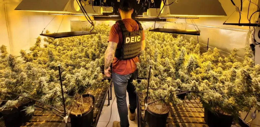 Um mandado de busca e apreensão expedido pela Justiça autorizou a entrada nas residências e confirmou as suspeitas. O homem estava em um dos imóveis quando a polícia chegou e ao tentar fugir acabou caindo da sacada, mas não se feriu com gravidade. Imagens mostram que as plantas já estavam grandes, algumas com meio metro de altura, prontas para comercialização.