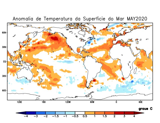 No mês maio de 2020 as águas no Pacífico Equatorial apresentaram anomalia mensal -0,5°C a 1,0°C, mantendo a condição de Neutralidade observada nos meses anteriores, porém apresentando área de resfriamento de TSM.