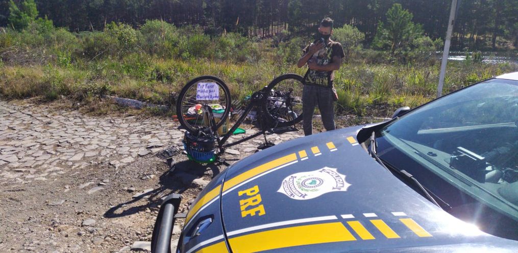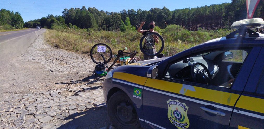 Policiais rodoviários federais realizavam ronda na BR 282, em Ponte Serrada, oeste catarinense, quando viram um ciclista com a bicicleta quebrada e um cartaz pedindo auxílio. Os policiais pararam e viram que se tratava de um colombiano de 27 anos, ator de rua, que atualmente mora no Chile e que está viajando pela América do Sul. No momento ele está vindo do Uruguai e indo para o Nordeste do Brasil.
