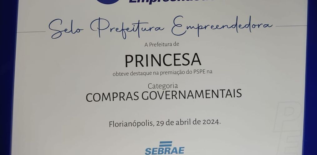 Princesa está entre as cinco cidades Catarinenses destaques do prêmio “Prefeitura Empreendedora” 2024.