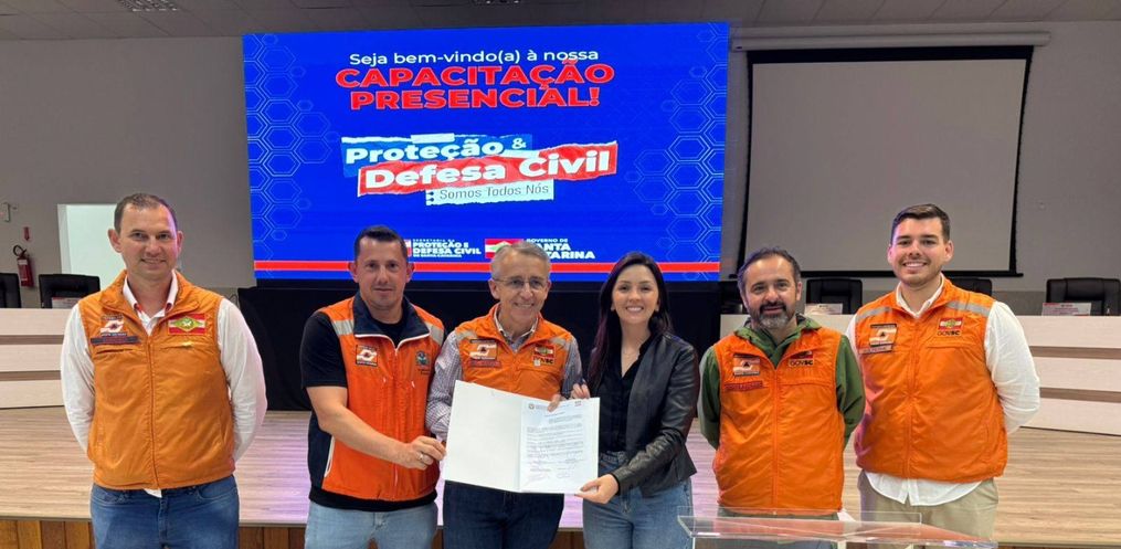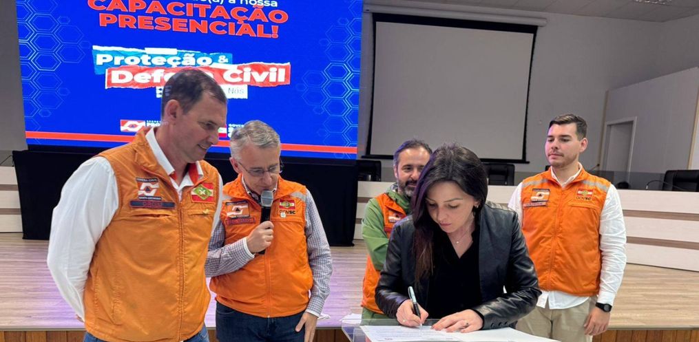 O município está entre os contemplados com os novos investimentos da Secretaria de Estado da Proteção e Defesa Civil (SPDC/SC). O ato de parceria contou com a presença da prefeita Diangele Marmitt e do coordenador local da Defesa Civil, Silvio da Silveira. A assinatura ocorreu nesta terça-feira (30), em São Miguel do Oeste, durante capacitação regional que reuniu lideranças, técnicos e representantes municipais das associações do Oeste. Entre as lideranças estava o Secretário de Estado da Proteção e Defesa Civil, Mário Hildebrandt.
