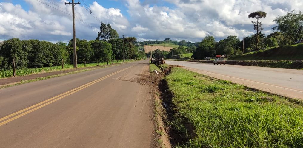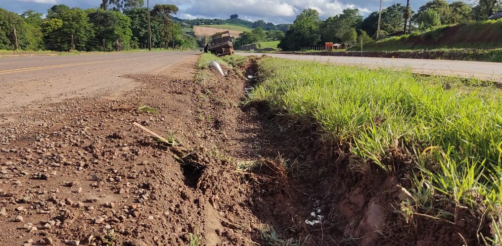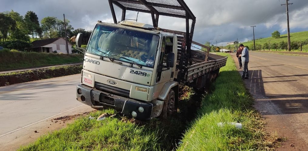 Motorista perde controle de a direção após o caminhão apresentar um problema mecânico. A saída de pista foi registrada na manhã desta sexta-feira, 03, por volta das 10h30.