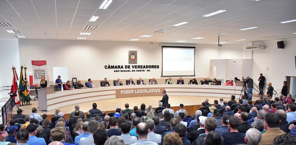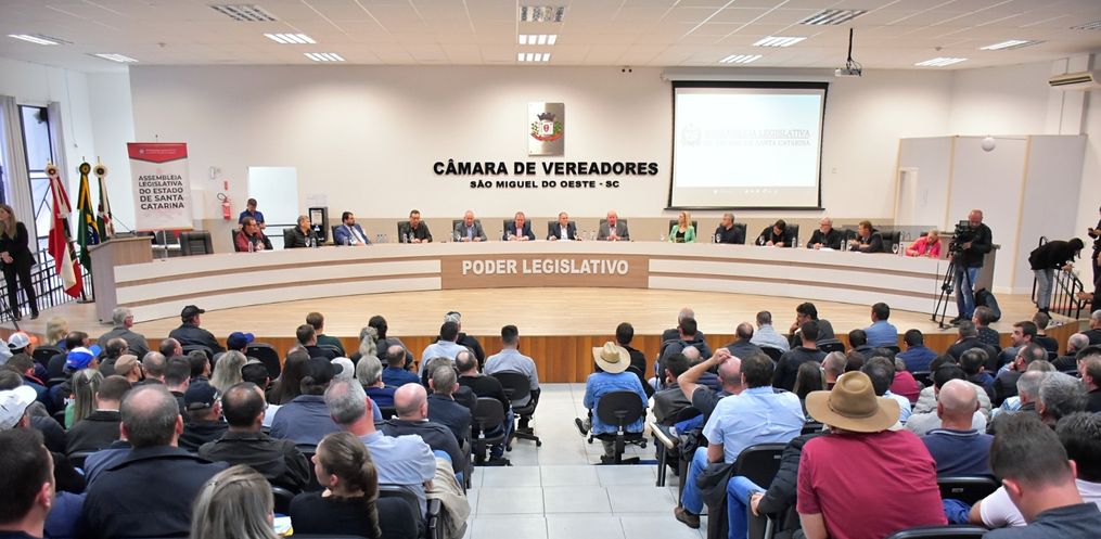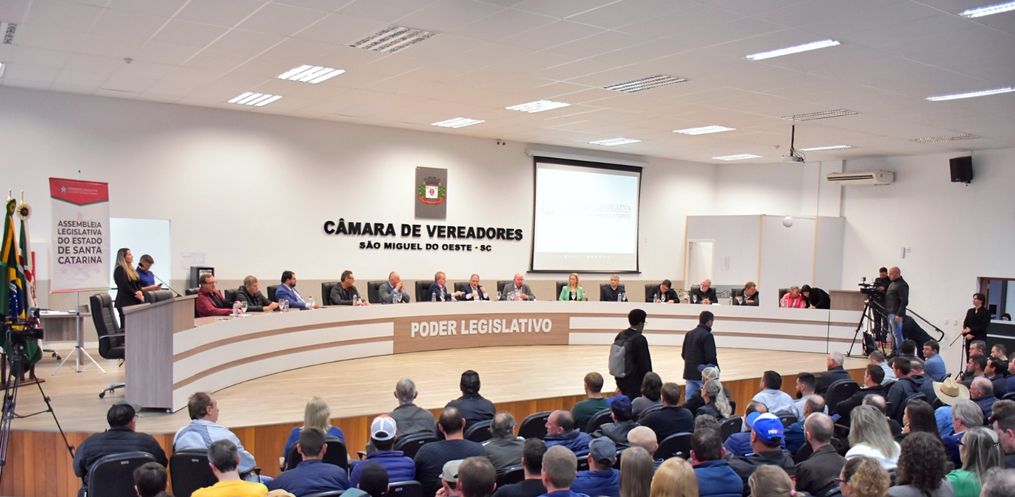 A Câmara de Vereadores de São Miguel do Oeste ficou lotada para a Audiência Pública que discutiu a situação dos produtores de leite em Santa Catarina. O evento foi realizado na tarde desta sexta-feira, 01, e foi promovido pela Comissão de Agricultura da Assembleia Legislativa. Segundo o presidente da comissão, Altair Silva, os principais temas do debate foram os custos de produção e os impactos da importação de leite em pó de países do Mercosul. Ele disse que esses dois aspectos estão criando dificuldades e levando muitos produtores a abandonar a atividade. Silva ressaltou que o objetivo da audiência é ouvir os produtores e apontar medidas para auxiliar a cadeia produtiva nacional.