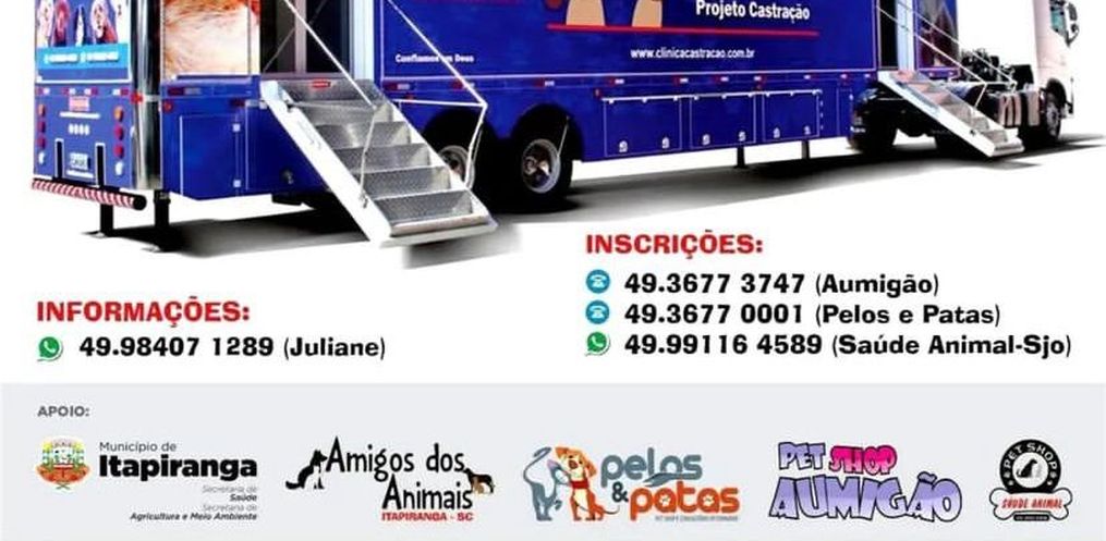 A carreta do projeto castração estará em Itapiranga dia 31 de agosto, uma quarta-feira, no Complexo Oktober. As inscrições já podem ser feitas em Pet Shop da cidade e também em São João do Oeste.