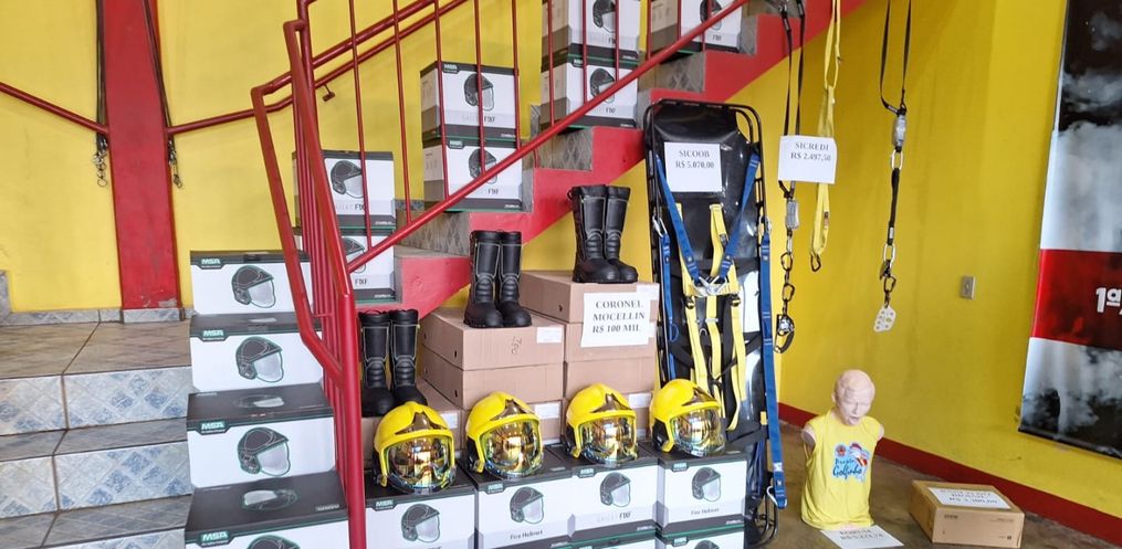 Durante a cerimônia foram entregues novos materiais para os bombeiros, como capacetes, botas e luvas, fruto de uma contribuição no valor de 100 mil reais, viabilizados pelo ex-deputado Coronel Mussolini, e de parcerias com instituições como o Banco do Brasil e Sicoob.