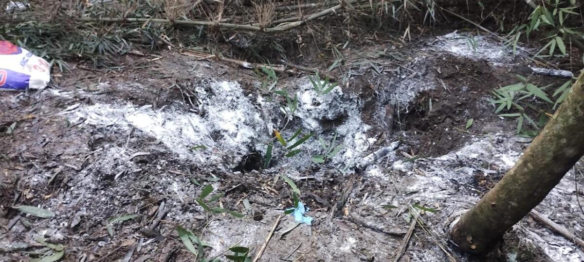 Ao perceberem a presença policial, os homens fugiram pela mata. Ainda assim, os investigadores já tinham identificado que o grupo tentava esconder um cadáver em uma vala rasa, praticamente coberto com cal. No local, também havia cheiro forte de putrefação e sinais de queima de matéria orgânica.