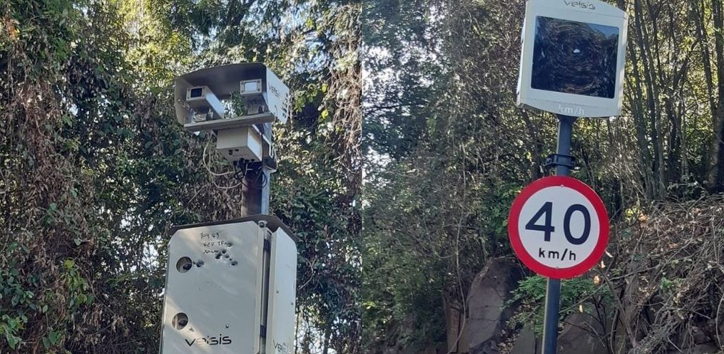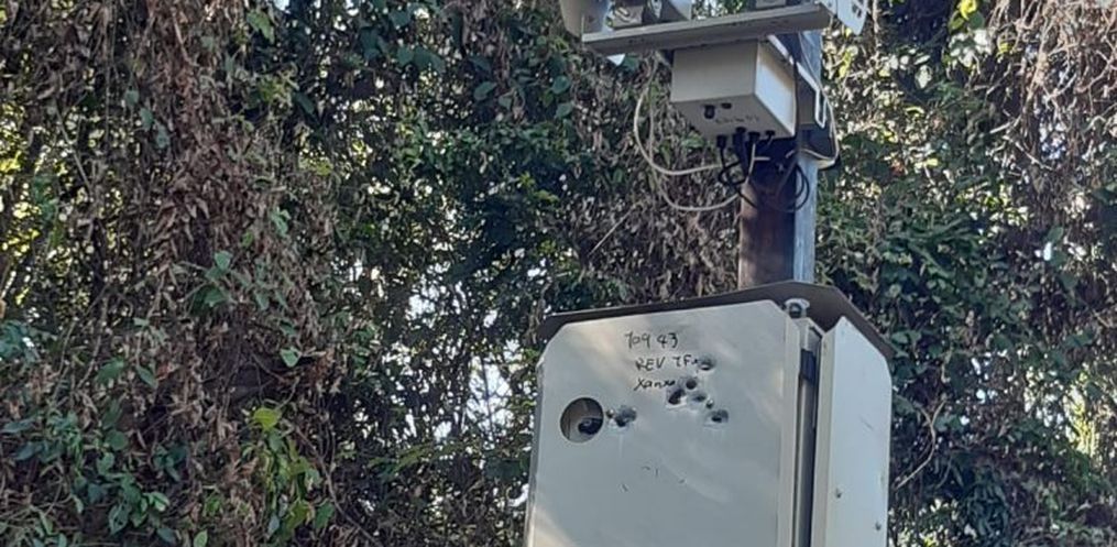 O radar localizado na BR-282 no trecho conhecido como Curva do Coelho, entre Cordilheira Alta e Xaxim, no Oeste de Santa Catarina, foi atingido com diversos disparos de arma de fogo. Leitores do ClicRDC encaminharam as fotos à equipe de reportagem na manhã desta quarta-feira, 02.
