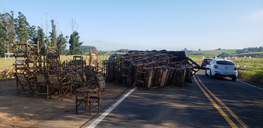 Um reboque carregado com cadeiras de bambu tombou na manhã desta quarta-feira, 19, na SC-163, na localidade conhecida como “curva da morte”, entre os municípios de Iporã do Oeste e Descanso.