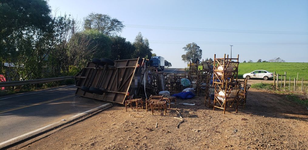 O reboque era puxado por uma camionete Chevrolet/S10, com placas Mercosul, que não chegou a capotar. A carga de cadeiras de bambu tinha como destino o Rio Grande do Sul e parte dela ficou destruída.