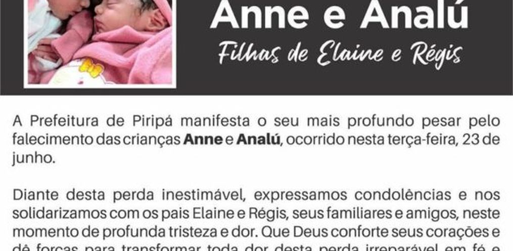 Em nota divulgada nas redes sociais, a prefeitura de Piripá manifestou o mais profundo pesar pelo falecimento das bebês.