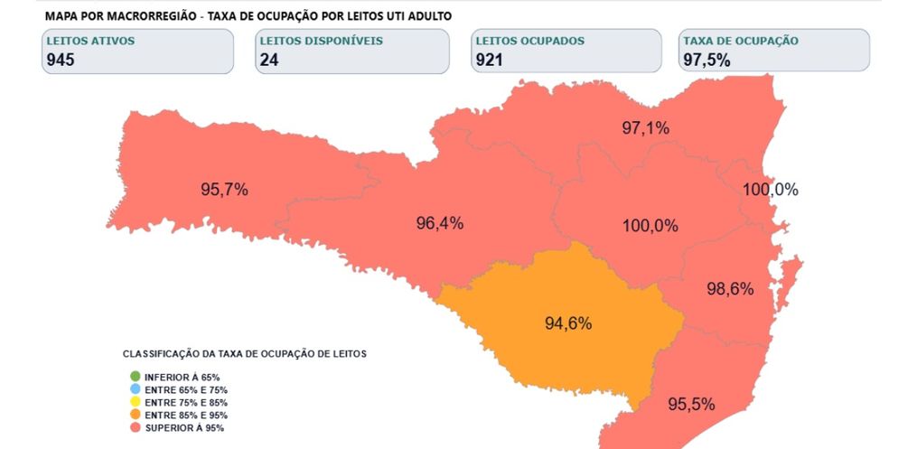 A Grande Florianópolis (98,6%) e o Grande Oeste (95,7%) são as regiões que se aproximam da taxa de ocupação total, com dois e três leitos adulto disponíveis, em ordem. Na sequência, a região da Serra catarinense (94,6% de ocupação) aparece com apenas três leitos disponíveis, seguida do Meio Oeste (94,4%) com apenas quatro. As demais regiões estão com a situação mais “controlada”, com pelo menos seis leitos disponíveis.