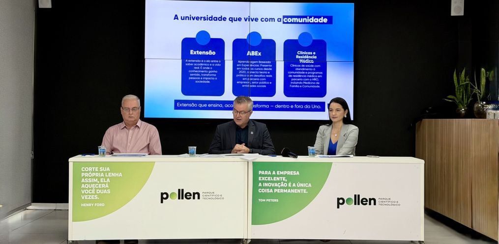 A Unochapecó realizou, na manhã de quarta-feira (18), no Ático do Pollen Parque Científico e Tecnológico, a tradicional coletiva de imprensa da reitoria, ocasião em que foram apresentados o balanço institucional de 2025, os principais resultados do ano e as projeções estratégicas para 2026. O encontro reuniu o reitor da universidade, Claudio Jacoski; o vice-reitor, José Alexandre De Toni; e a pró-reitora de ensino, pesquisa e extensão, Adréa de Almeida Leite Marocco.