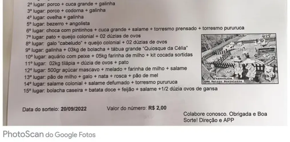 A famosa Rifa da Fazendinha voltou, e quem tiver um bilhete premiado pode ganhar um galo de bombacha ou o já tradicional porco. O sorteio é realizado em Nova Veneza, no Sul de Santa Catarina e ficou nacionalmente conhecido quando os prêmios foram lidos em voz alta na câmara de vereadores e o vídeo da reação dos parlamentares viralizou. A Escola Básica Municipal Bairro Bortolotto divulgou nesta quarta-feira (7) a lista dos prêmios desta edição.