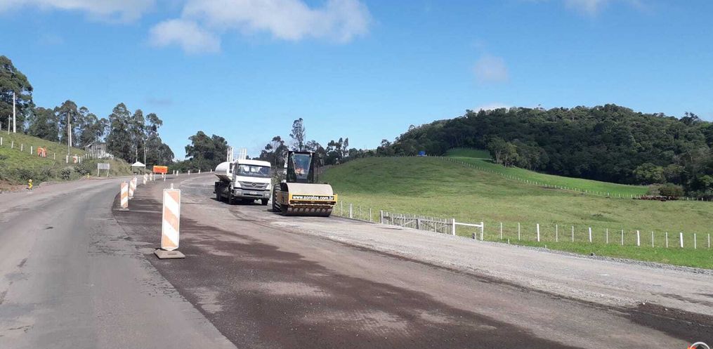 A empreiteira Torc segue trabalhando na ampliação, fresagem e adequação da rodovia federal, BR-163, no trecho nas imediações da Linha Santo Antônio, São José do Cedro, nesta quinta-feira, 12. No início desta tarde, os funcionários aguardavam a chegada de mais massa de concreto para dar continuidade na pavimentação. As cargas de concreto são trazidas por caminhões caçamba da usina localizada na Linha Daltro Filho, Guaraciaba, proximidades do trevo de acesso à Anchieta.