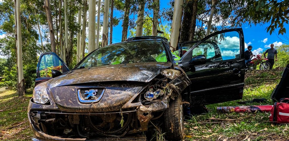 Segundo apurado, ela seguia sentido Guaraciaba, quando na direção aposta acontecia uma ultrapassagem entre dois caminhões, para evitar que algo pior acontecesse, ela acabou saindo da pista com o carro, um Peugeot.