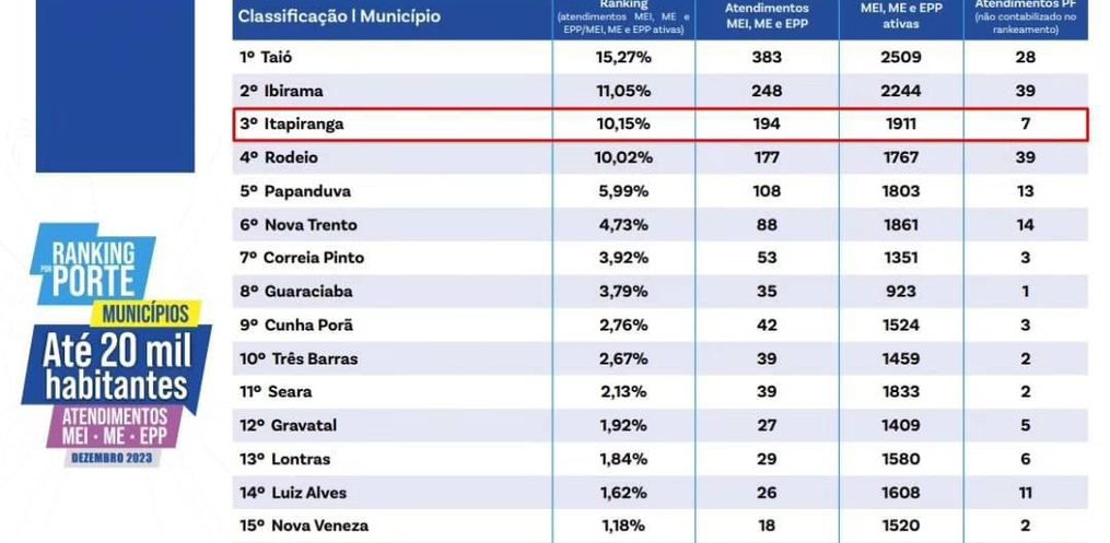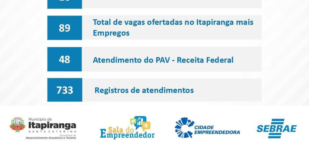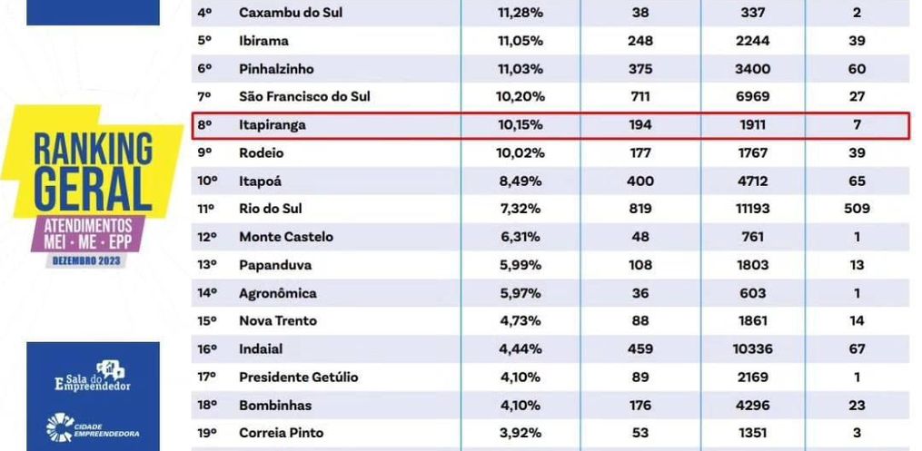 A Sala do Empreendedor de Itapiranga também recebeu a 8ª colocação de atendimentos prestados do estado de Santa Catarina. O propósito da divulgação é informar sobre o desempenho da sala em relação aos atendimentos, possibilitando comparação dos municípios. Flávia Reis explica que a sala oferece serviços como aberturas de MEI’s, formalização, alterações das atividades, notas, prestação de serviços e baixas. Atualmente, são 1.258 MEI’s ativos no município, sendo 16 aberturas já realizadas somente no mês de janeiro.
