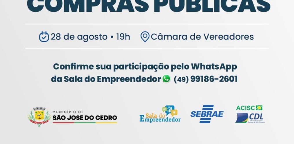 A Sala do Empreendedor de São José do Cedro convida empreendedores locais para uma capacitação gratuita sobre Compras Públicas, que será realizada no dia 28 de agosto (quinta-feira), às 19h, na Câmara de Vereadores. O objetivo do encontro é apresentar estratégias para aumentar as chances de sucesso em licitações, ampliar a competitividade e possibilitar o acesso a um mercado cada vez mais amplo para o crescimento das empresas cedrenses.