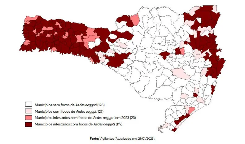 Ainda em relação ao início do ano passado, Santa Catarina registrou agora um aumento no número de municípios considerados infestados pelo mosquito Aedes aegypti: são 142, quantidade 20,3% maior do que a das três primeiras semanas de 2022, com 118 cidades nessa condição.