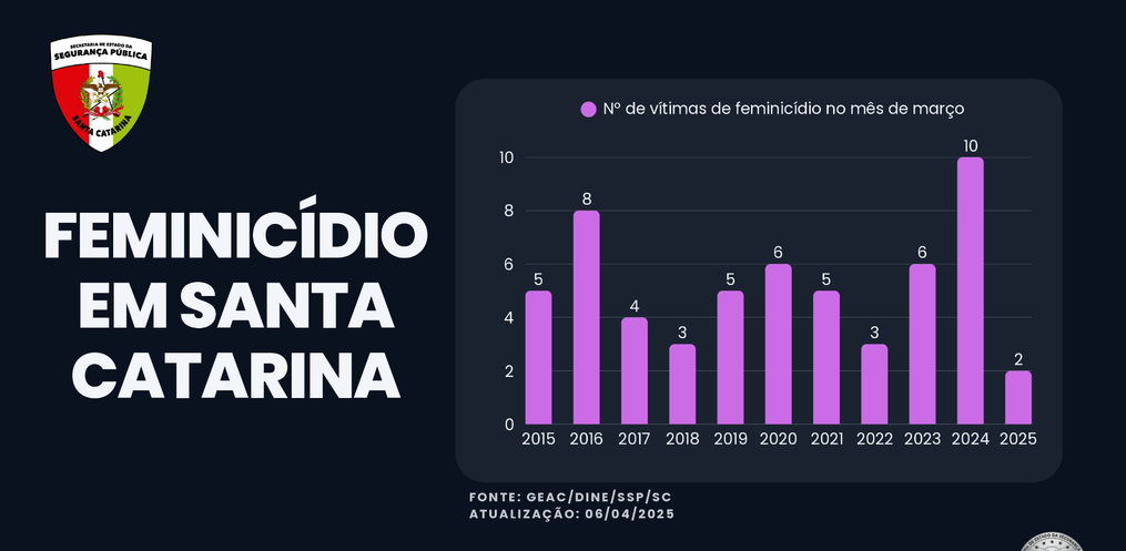 Santa Catarina alcançou um marco histórico no combate à violência contra a mulher. Dados da Secretaria de Estado da Segurança Pública (SSP-SC) mostram que o Estado registrou, no mês de março de 2025, o menor número de feminicídios dos últimos dez anos: foram duas vítimas, contra dez no mesmo período de 2024, o que representa uma redução de 80%.
