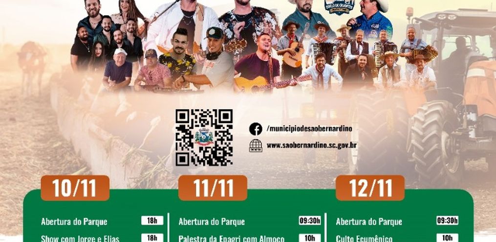 Já para o sábado, 11, a abertura dos estandes vai ser as 9h30, e durante o dia são várias programações com palestra da Epagri e Rodeio Country. Um dos grandes destaques, é para o show com Welinton Pedro, que participou do The Voice Kids da Rede Globo, e o show nacional com Bruno e Denner.