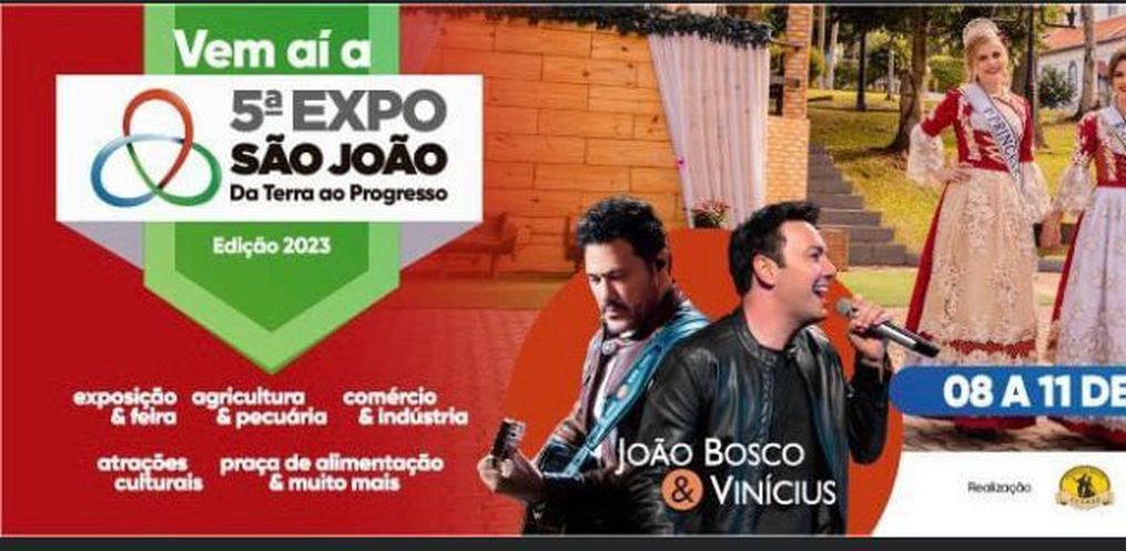 A dupla sertaneja João Bosco e Vinícius será a principal atração musical da 5ª Expo São João. O anúncio foi feito na noite desta sexta-feira, 15, em evento promovido na Sociedade Aliança.