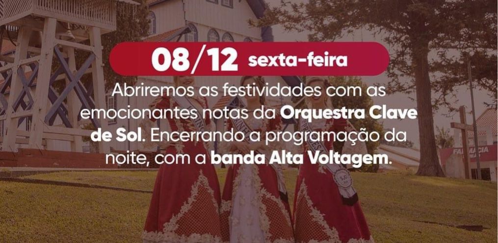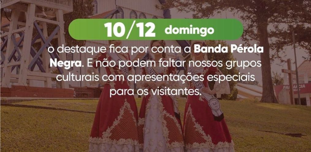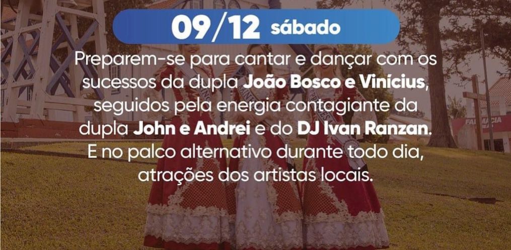 No sábado, dia 09, terá show nacional da dupla sertaneja João Bosco e Vinícius, seguido pela dupla John e Andrei e DJ Ivan Ranzan. No palco alternativo, durante todo o dia terá atrações dos artistas locais. No domingo, dia 10 de dezembro, terá a Banda Alvorecer, Grupo Arcanjo e Banda Pérola Negra.