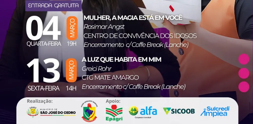 O município de São José do Cedro promove, neste mês de março, um encontro especial dedicado às mulheres, com o objetivo de celebrar sua força, inspiração e protagonismo. A programação, organizada pela Prefeitura em parceria com o Poder Legislativo, contará com dois momentos marcantes: no dia 4 de março, às 19h, no Centro de Convivência dos Idosos, a palestrante Rosimar Angst apresenta o tema “Mulher, a magia está em você”; já no dia 13 de março, às 14h, no CTG Mate Amargo, será a vez de Greici Rohr conduzir a palestra “A luz que habita em mim”. Ambas as palestras têm como objetivo valorizar e fortalecer o papel das mulheres na sociedade. O evento é gratuito e aberto ao público, oferecendo também um momento de confraternização com coffee break.