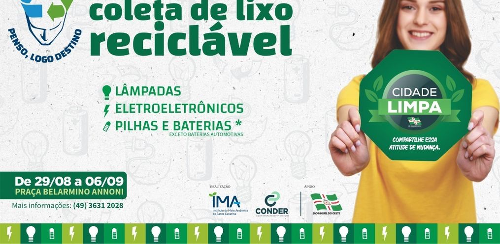 De acordo com o diretor ambiental da Prefeitura de São Miguel e coordenador da ação, Valmor Povala, faz parte do programa a Coleta de Material Reciclável para recolha de lâmpadas, eletroeletrônicos, pilhas e baterias (exceto baterias automotivas), que acontece entre os dias 29 de agosto e 06 de setembro, com a coleta no Município, na praça Belarmino Annoni.