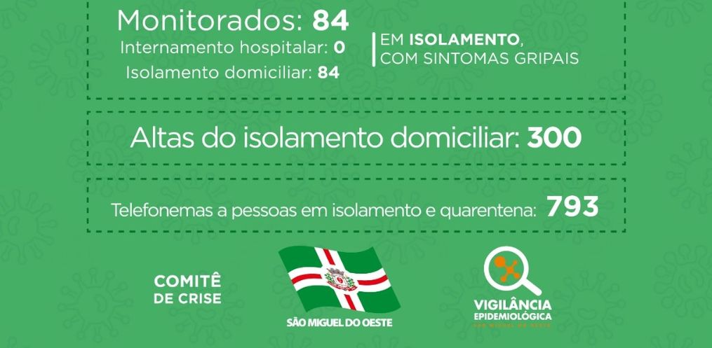 Em boletim epidemiológico divulgado nesta sexta-feira, 22, o município de São Miguel do Oeste não registrou mais nenhum novo caso confirmado de COVID-19 na cidade.