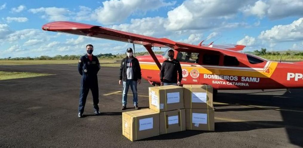 O material, usado como estratégia de combate da Covid-19 em Santa Catarina, foi transportado pelos aviões Arcanjos 02 e 04 dos Bombeiros.
