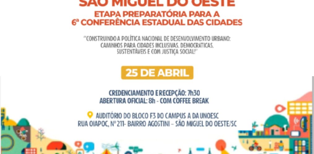 O município de São Miguel do Oeste se prepara para sediar, no próximo dia 25 de abril, a etapa municipal da Conferência Nacional das Cidades. O encontro será realizado na Unoesc, na sexta-feira, e vai reunir representantes da comunidade, universidades, associações, órgãos públicos e entidades envolvidas com o desenvolvimento urbano.