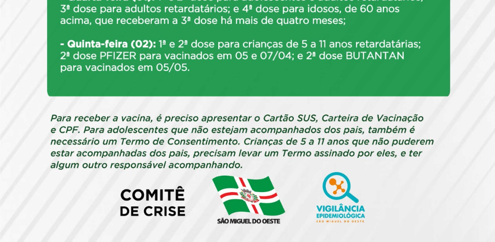 - Quarta-feira (01): 1ª e 2ª dose para adolescentes e adultos retardatários; 3ª dose para adultos retardatários; e 4ª dose para idosos, de 60 anos acima, que receberam a 3ª dose há mais de quatro meses;