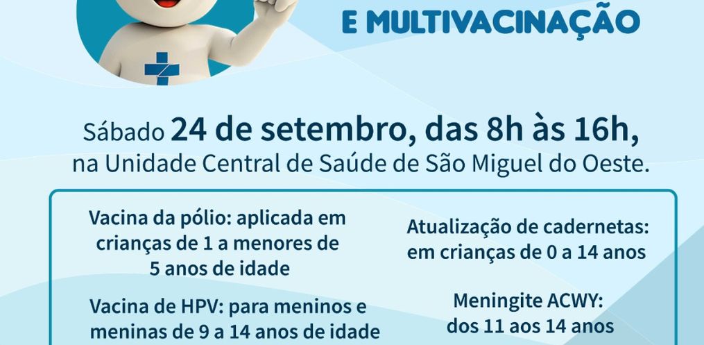 A Secretaria de Saúde de São Miguel do Oeste vai realizar neste sábado, 24, o Dia “D” da Campanha Nacional de Vacinação contra a Poliomielite e Multivacinação, prorrogada até o dia 30 de setembro