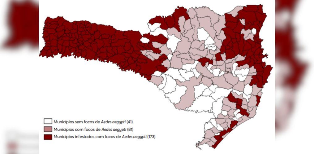 Entre os 295 municípios catarinenses, 173 (58.64%) estão infestados pelo vetor. Isso é determinado conforme a disseminação e manutenção dos focos.