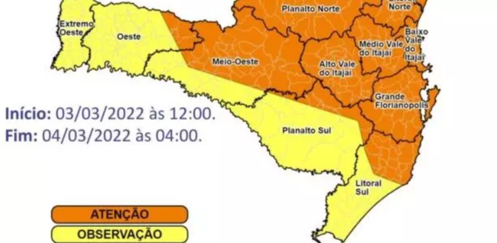 Santa Catarina pode ter temporais isolados e chuva intensa até às 4h desta sexta-feira, 04, segundo alerta meteorológico da Defesa Civil do Estado.