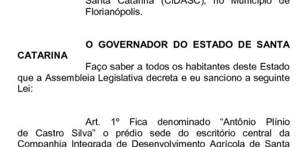 A sede da Companhia Integrada de Desenvolvimento Agrícola de Santa Catarina - CIDASC, em Florianópolis, passou a ser denominada de Antônio Plínio de Castro Silva. A Lei nº 18.506 de 30 de agosto de 2022 foi aprovada pela Alesc e sancionada pelo governador Carlos Moisés da Silva.